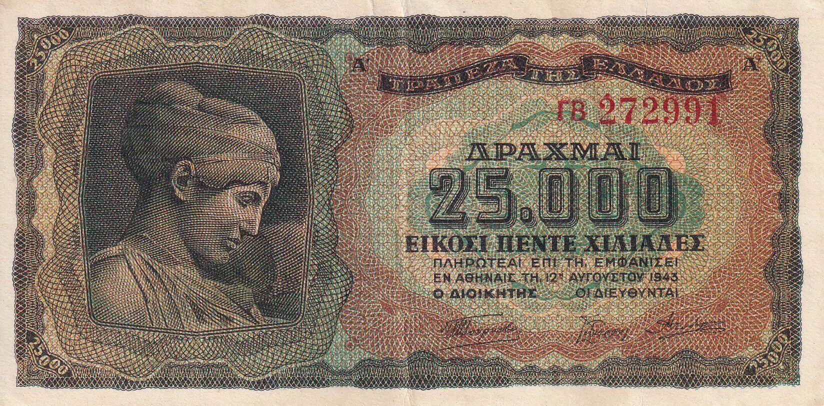 Billet Grèce 25000 Drachms - Femme - Monument - 1943 - Série B - SUP - P.123