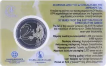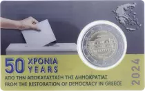 Le bord supérieur de l'image est orné de la mention "50 XPONIA A?O THN A?OKATA?TA?H TH? ?HMOKPATIA? - ???????? ?ΗΜΟΚΡΑΤΙΑ", qui signifie "50 ans depuis le rétablissement de la démocratie - République hellénique". Cette inscription souligne l'importance historique de l'année 1974, marquant la fin d'une période de régime militaire et le retour à un gouvernement démocratique. Les années "1974 - 2024" sont représentées respectivement à gauche et à droite du drapeau grec, indiquant une célébration des 50 ans de démocratie en Grèce. Le drapeau, avec ses rayures bleues et blanches, évoque la fierté nationale et l'unité du peuple grec.