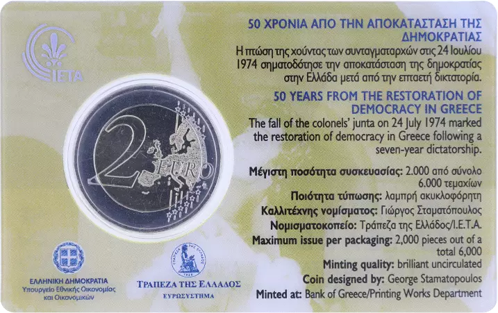 La palmette de l'institut d'émission grec est élégamment placée en bas de l'image, ajoutant une touche de sophistication et d'authenticité. Cette palmette, un symbole classique de l?art grec, reflète l?héritage culturel riche et les traditions artisanales du pays. Le sigle "?TAM", représentant le créateur de la pièce, est visible à droite, attestant du savoir-faire des artisans impliqués dans la conception de cette monnaie.