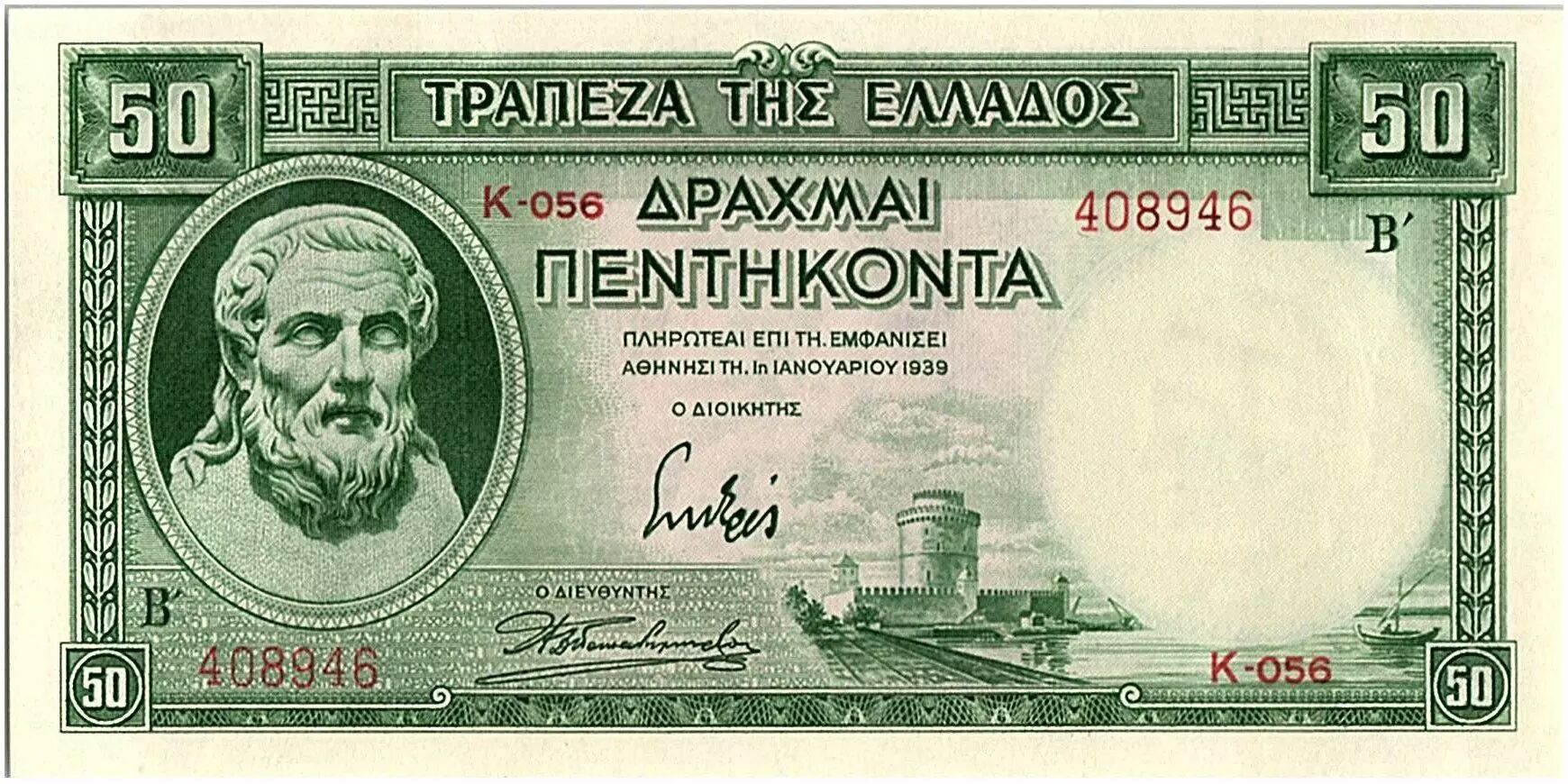 Accueil > Billets du Monde > Billets d'Europe > Grèce > Grèce 50 Drachmes, Hésiode, Frise - 1939