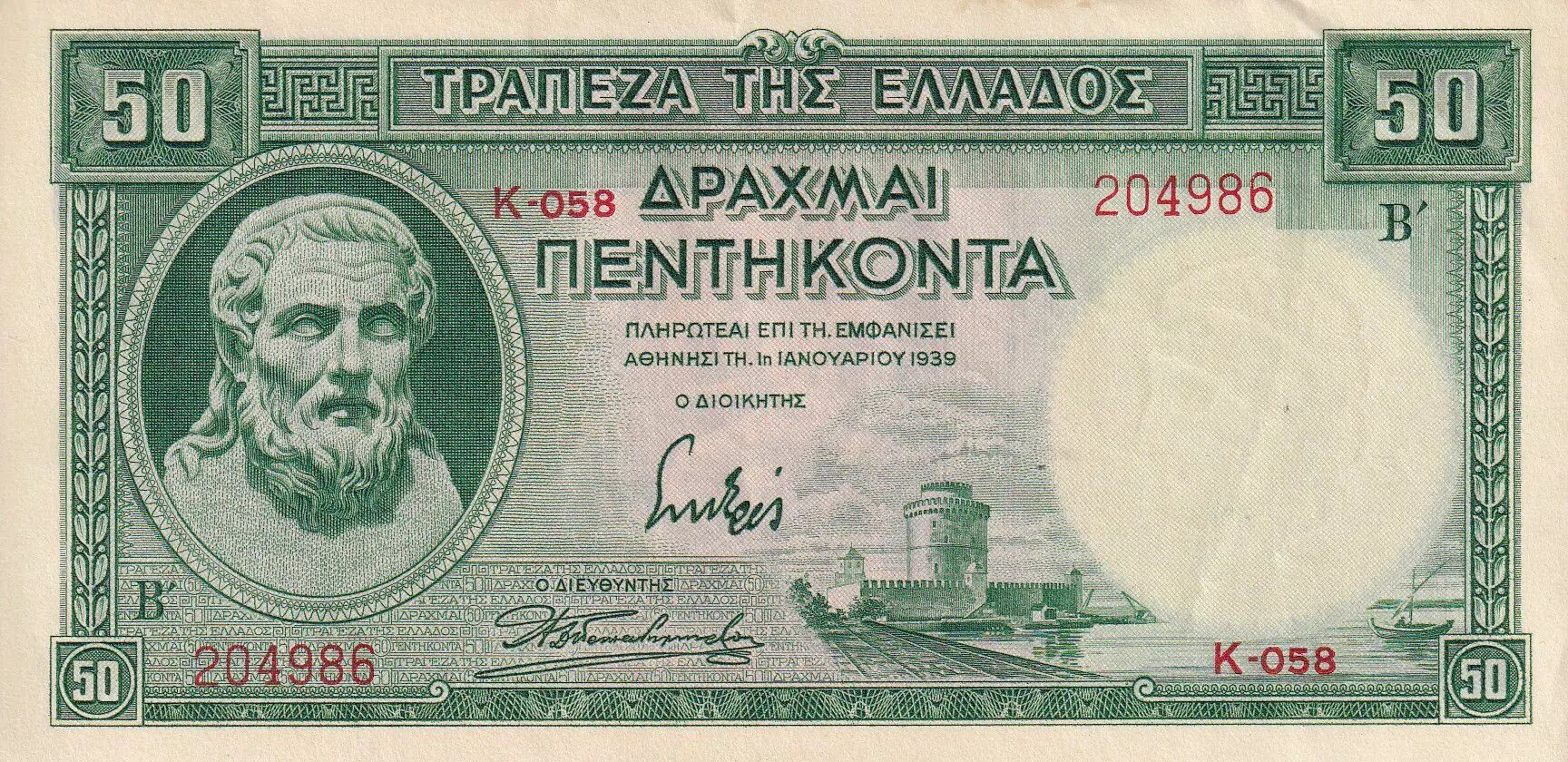 Billet Grèce 50 Drachms - Fort - Gravure - 1939 - Série K.058 - SUP - P.107