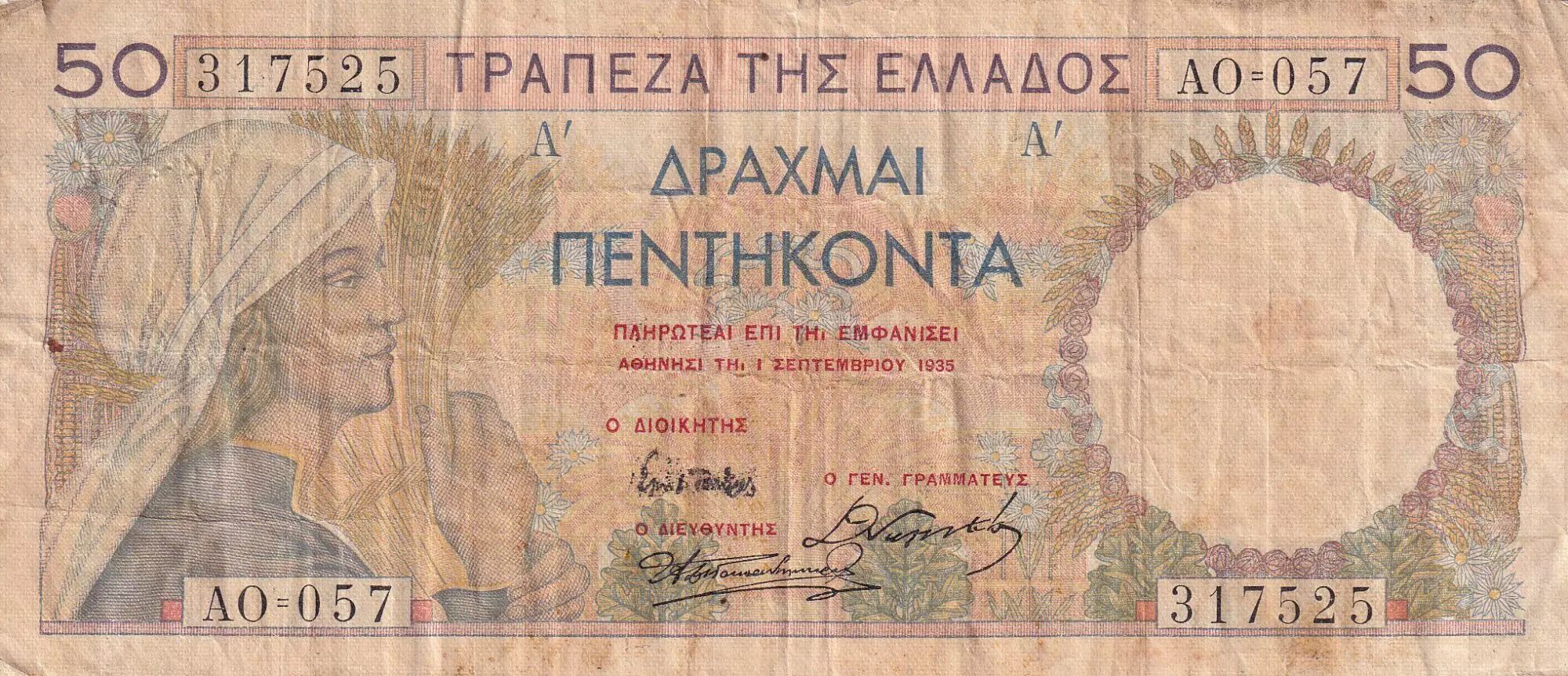 Billet Grèce 50 Drachms - Paysanne - Bas Relief - Cérès - 1935 - P.104a
