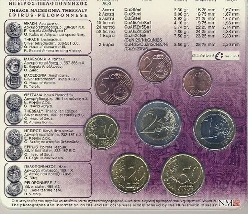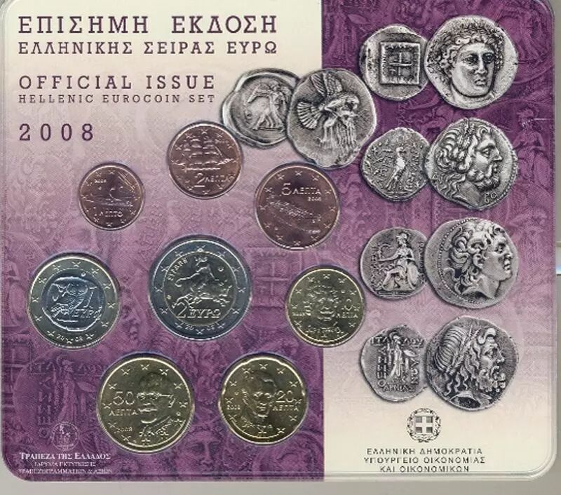 Les pièces en euro de la Grèce ont toutes des dessins différents avec un thème commun pour chacun des trois types. Les pièces de 1 2 et 5 centimes représentent des bateaux grecs les pièces de 10 20 et 50 centimes des Grecs célèbres et les pièces de 1 et 2 euros des dessins de la mythologie grecque.