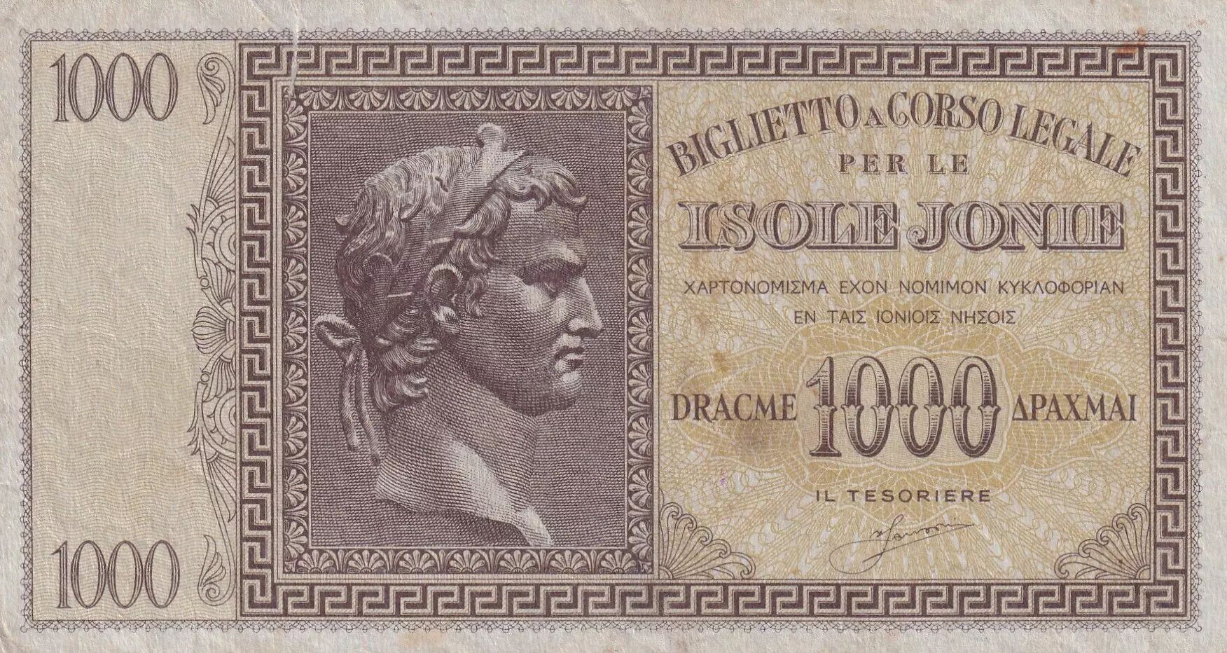 folds, stains. Nice note from Ionnian islandes issuing during the WWII during the italian occupation.