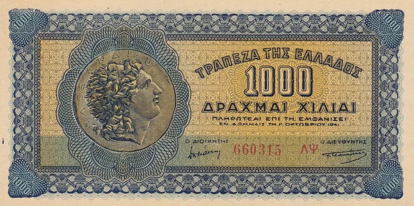 Banknote Greece 1000 Drachmes 1941 - Old coin from Alexandre