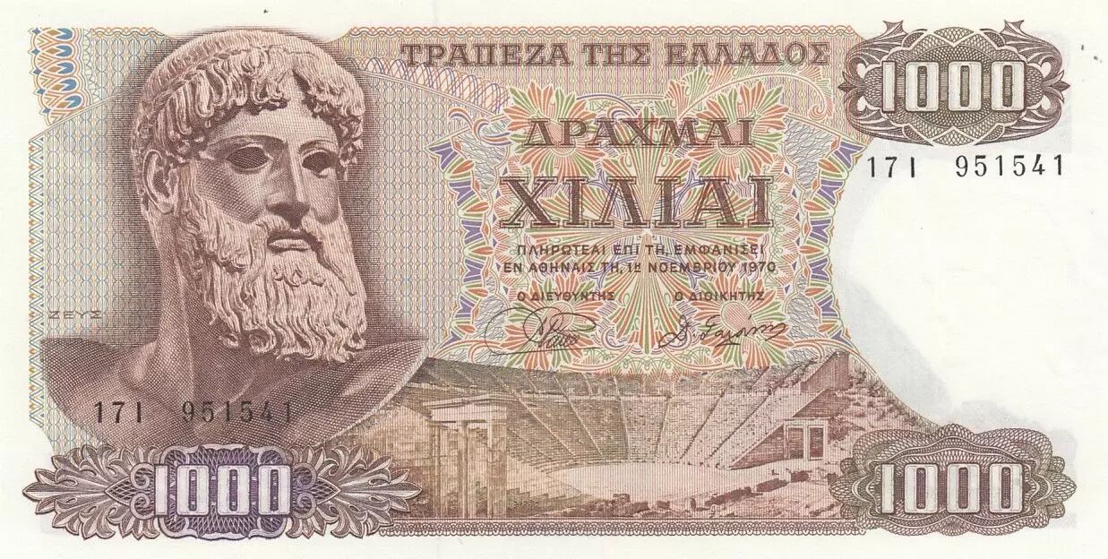 Home > World Banknotes > European Banknotes > Greece > Greece 1000 Drachmes 1970 - Zeus