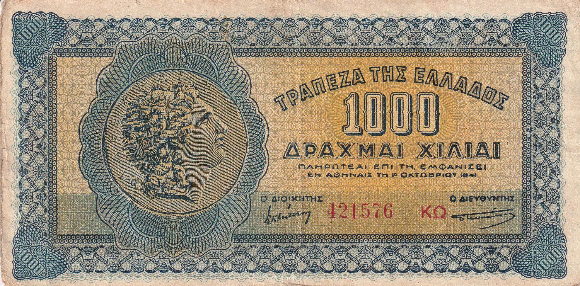 Home > > Greece 1000 Drachmes - God greek - 1941 - VF - P.117