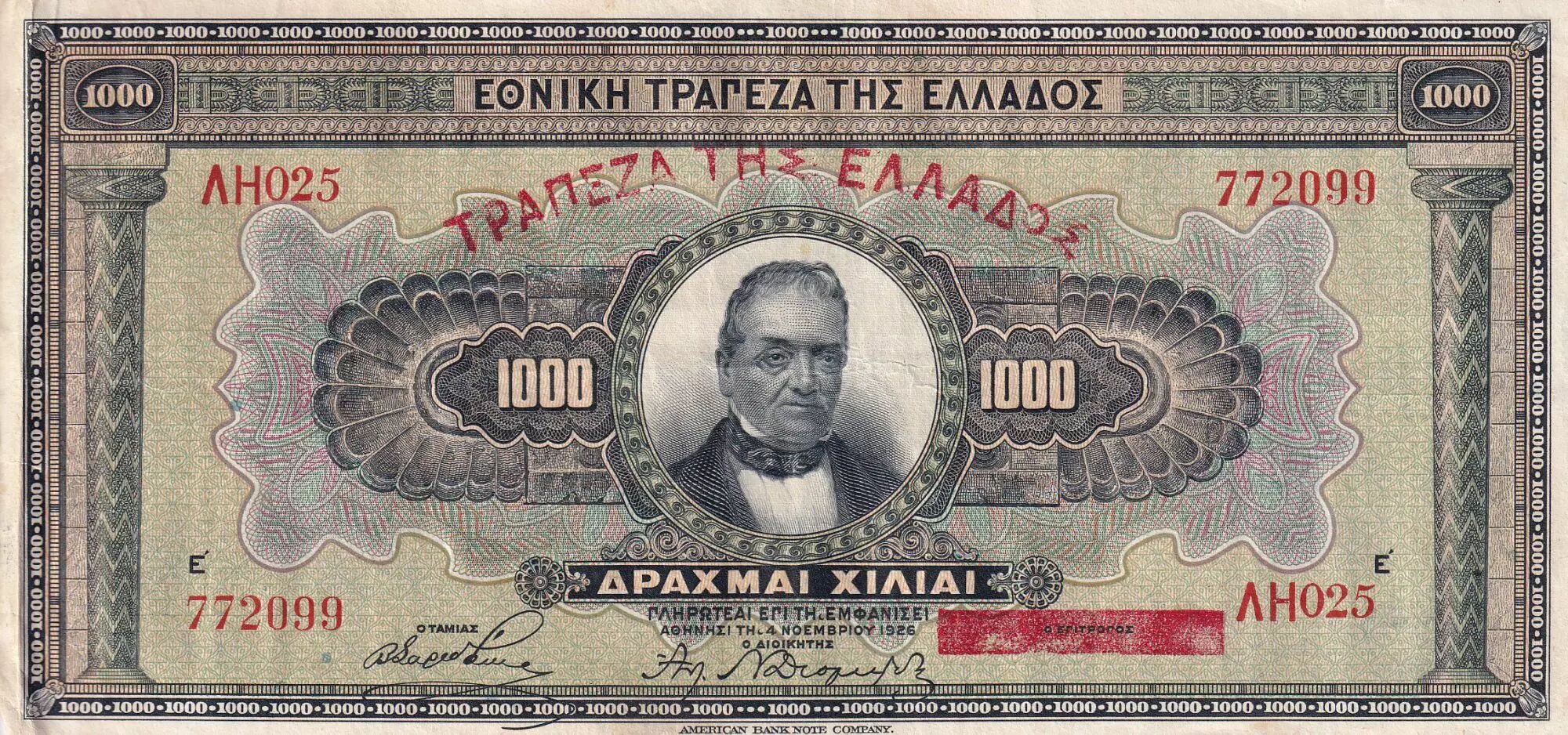 Home > > Greece 1000 Drachms - G. Stavros - 1926 - Serial AH - VF - P.100b