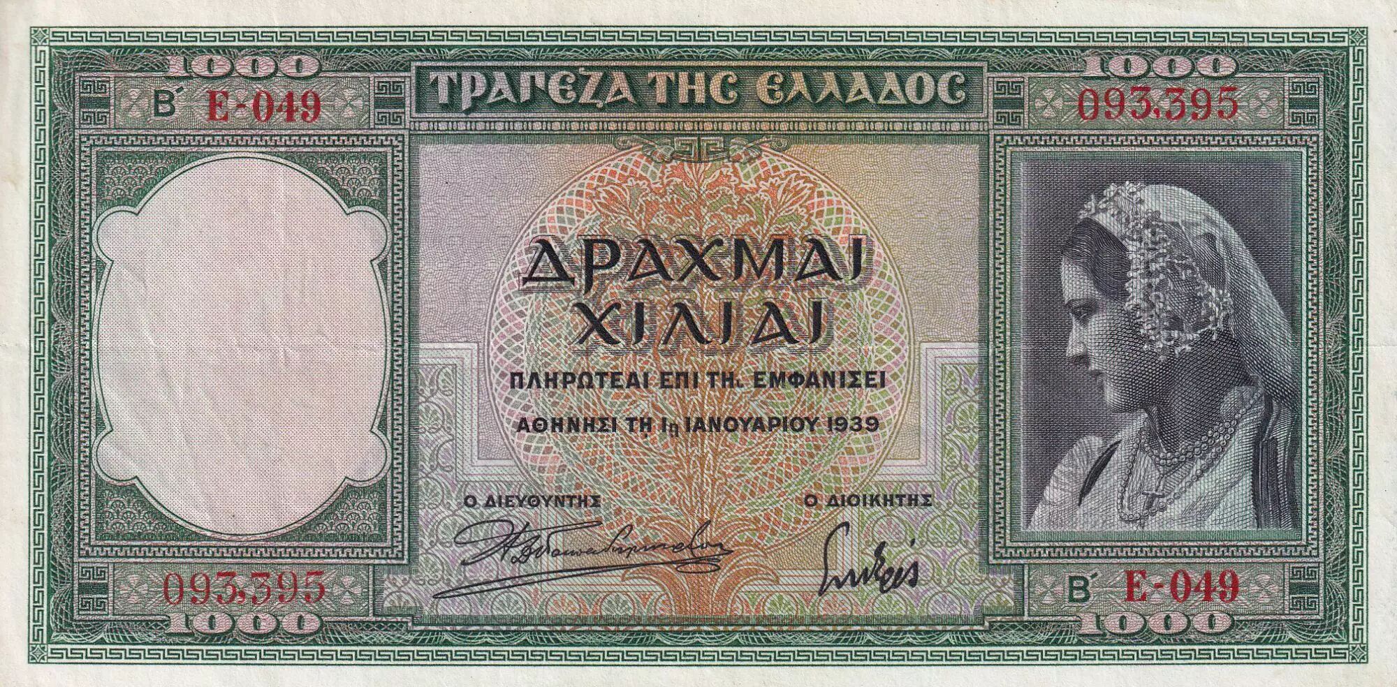 Banknote Greece 1000 Drachms - Woman - Parthenon - 1939 - Serial E.049 - P.110a