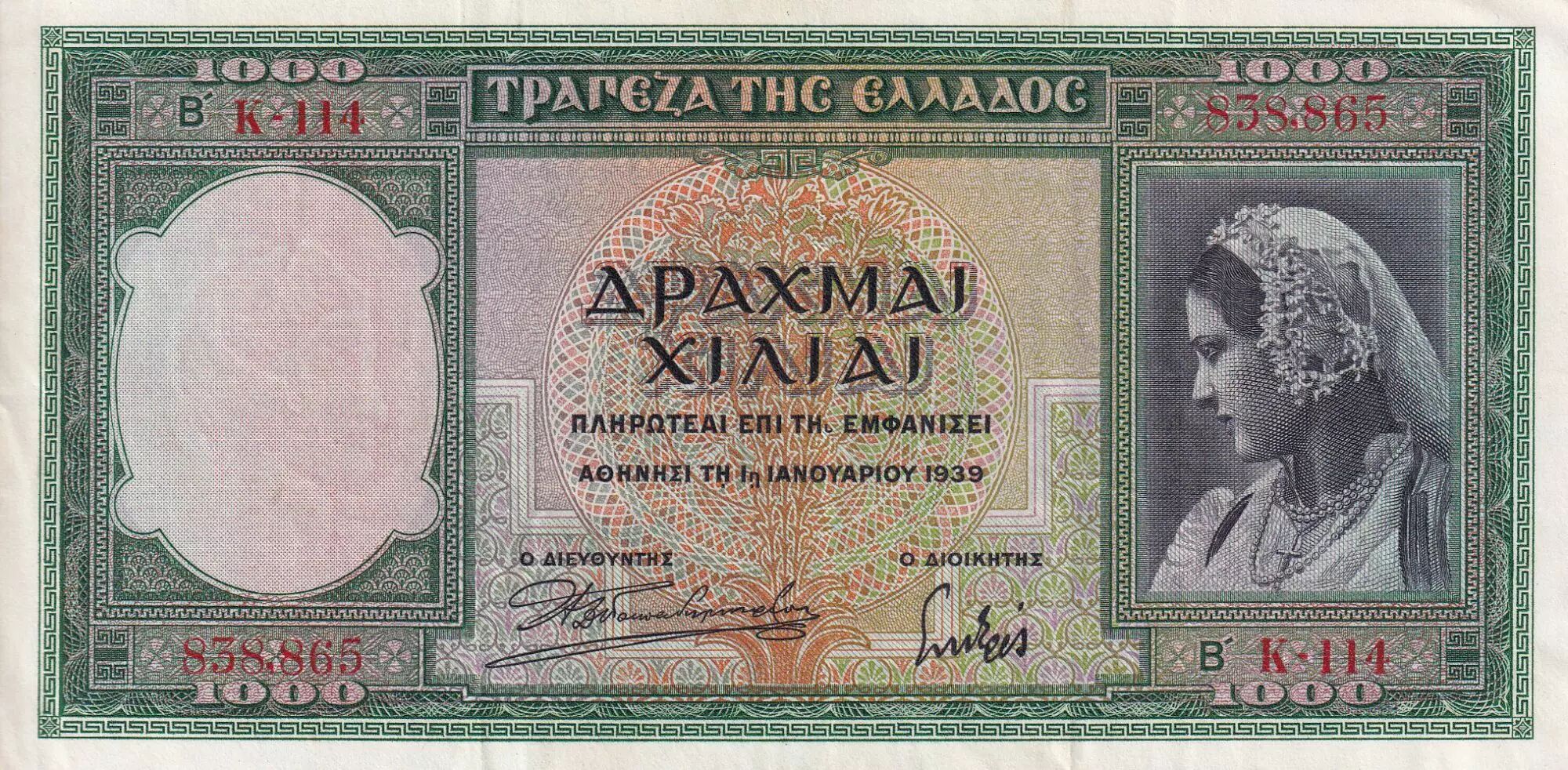 Home > World Banknotes > European Banknotes > Greece > Greece 1000 Drachms - Woman - Parthenon - 1939 - Serial K.114 - P.110a