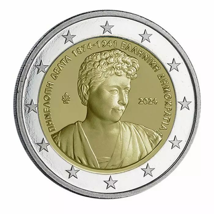 Portrait of the famous Greek writer Penelope Delta (1874 - 1941), looking to the right. Above is the design and State of Issue "?HNE?O?H? ?E?TA 1874 - 1941 Ε??ΗÎΙΚΗ ?ΗΜΟΚΡΑΤΙΑ". On the left edge of the image is the palmette of the Greek mint and on the right edge is the date "2024"; on the right, at the bottom of the portrait, is the abbreviation "?TAM" of the coin's creator.