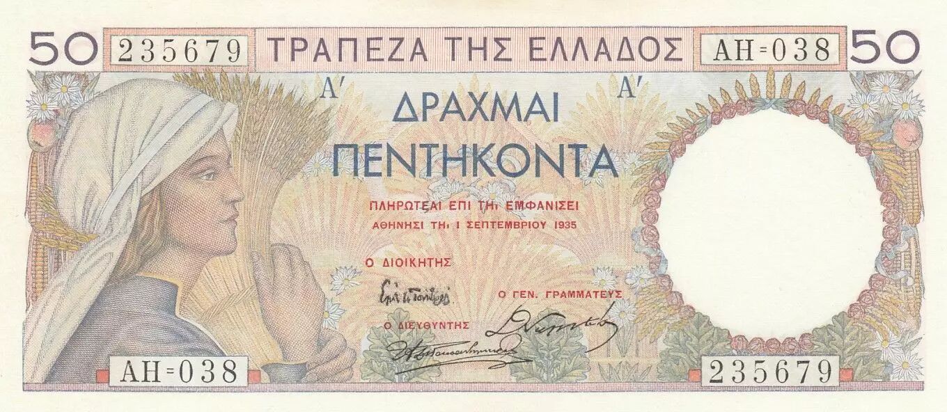 Home > World Banknotes > European Banknotes > Greece > Greece 50 Drachms - Woman Farmer - Ceres - 1935 - Serial AH