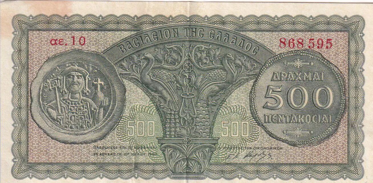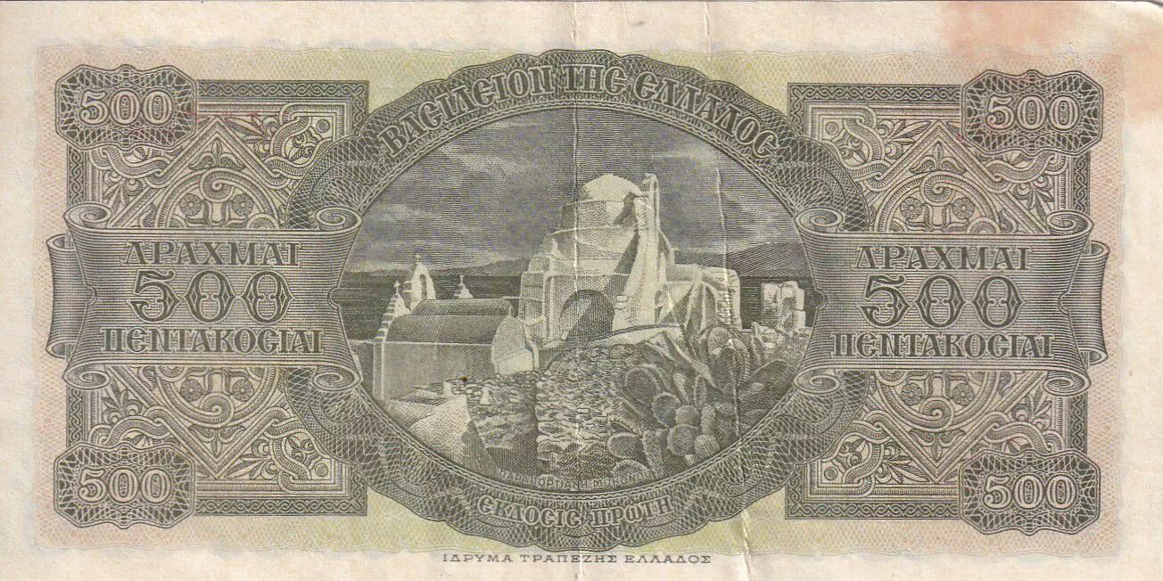 Banknote Greece 500 Drachms - Byzantin coin - Church - 1950 - P.325a