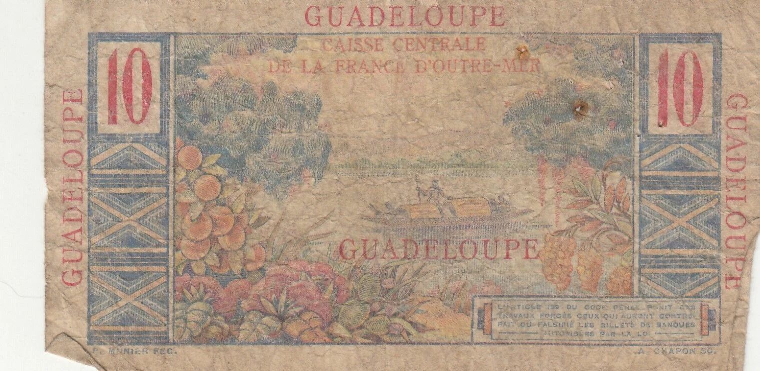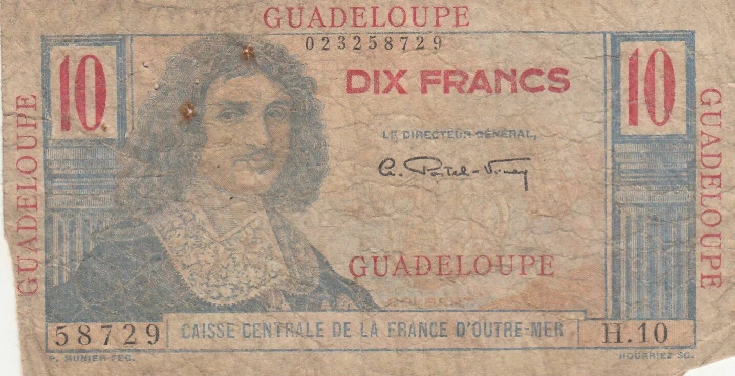 Le billet de 10 francs Colbert, émis en Guadeloupe, fait partie de la série H.10 et a été en circulation de 1947 à 1949. Ce billet possède une valeur nominale de 10 francs, l'unité monétaire de l'époque dans la région.