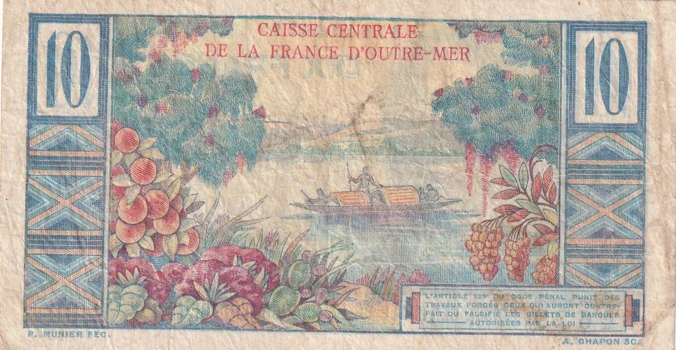 The front of the banknote features a portrait of Jean-Baptiste Colbert, positioned on the left side. The inscriptions "DIX FRANCS" and "CAISSE CENTRALE DE LA FRANCE D'OUTRE-MER" are also present. One can also read "P. MUNIER FEC. HOURRIEZ SC.", indicating the names of the artists involved in the creation of the banknote. Pierre Munier is credited as the designer, while Georges Hourriez is identified as the engraver.