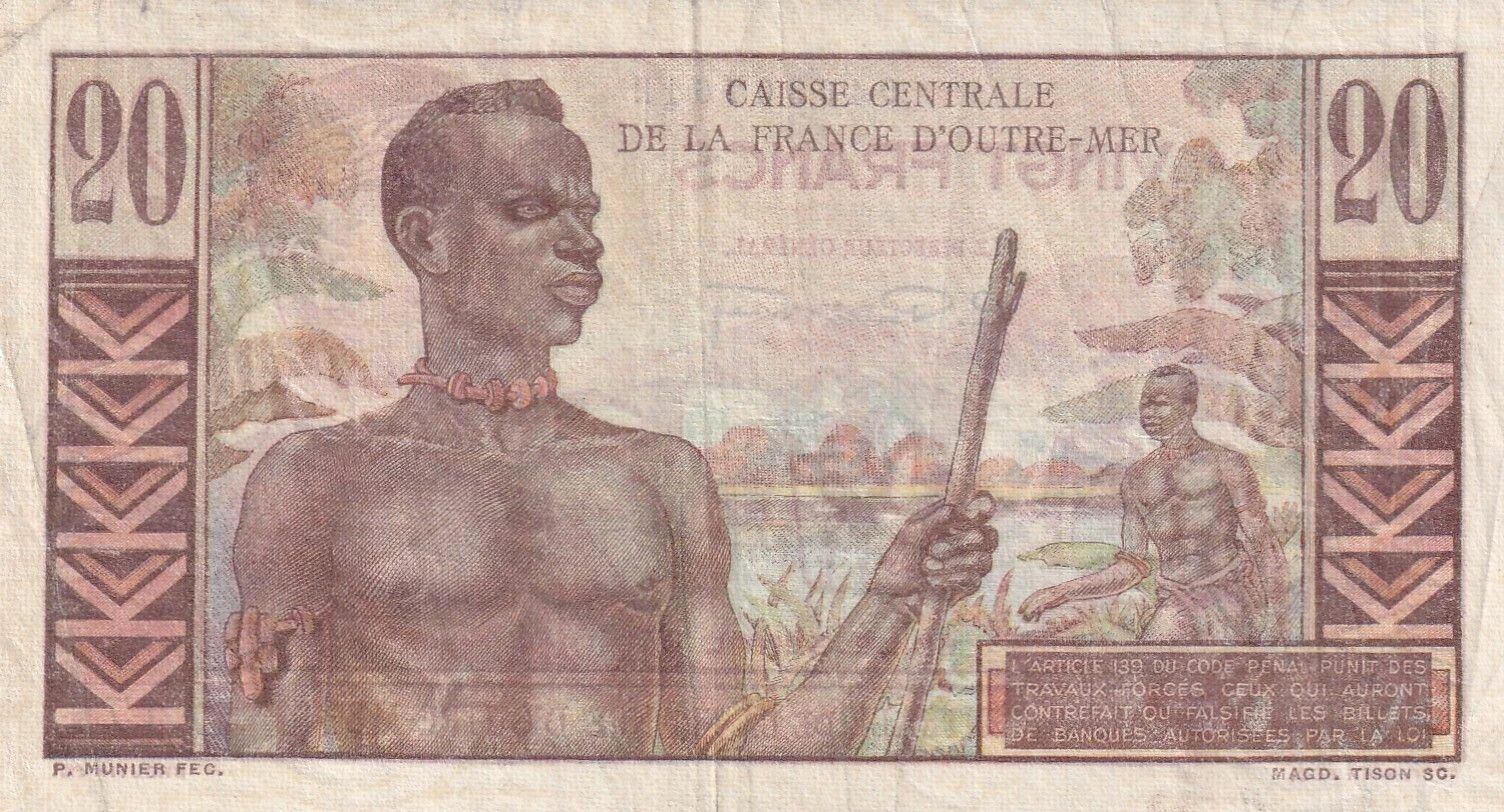 Sur le recto, on observe un portrait d'Émile Gentil ainsi qu'une représentation d'un village constitué de huttes. Les inscriptions en caractères latins indiquent la valeur nominale "20 VINGT FRANCS 20" et l'institution émettrice "CAISSE CENTRALE DE LA FRANCE D'OUTRE-MER". On y trouve également les noms des artistes ayant participé à sa création : "P. MUNIER FEC." et "BROUTIN SC.".