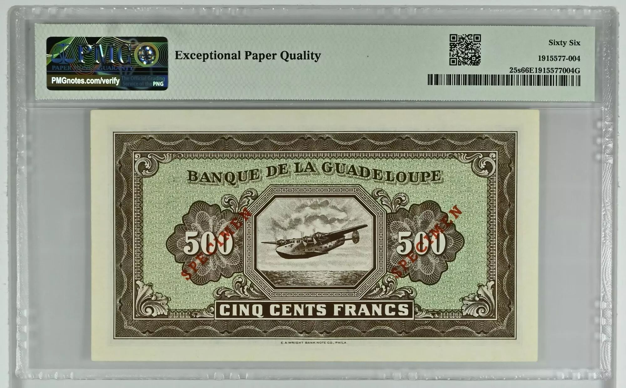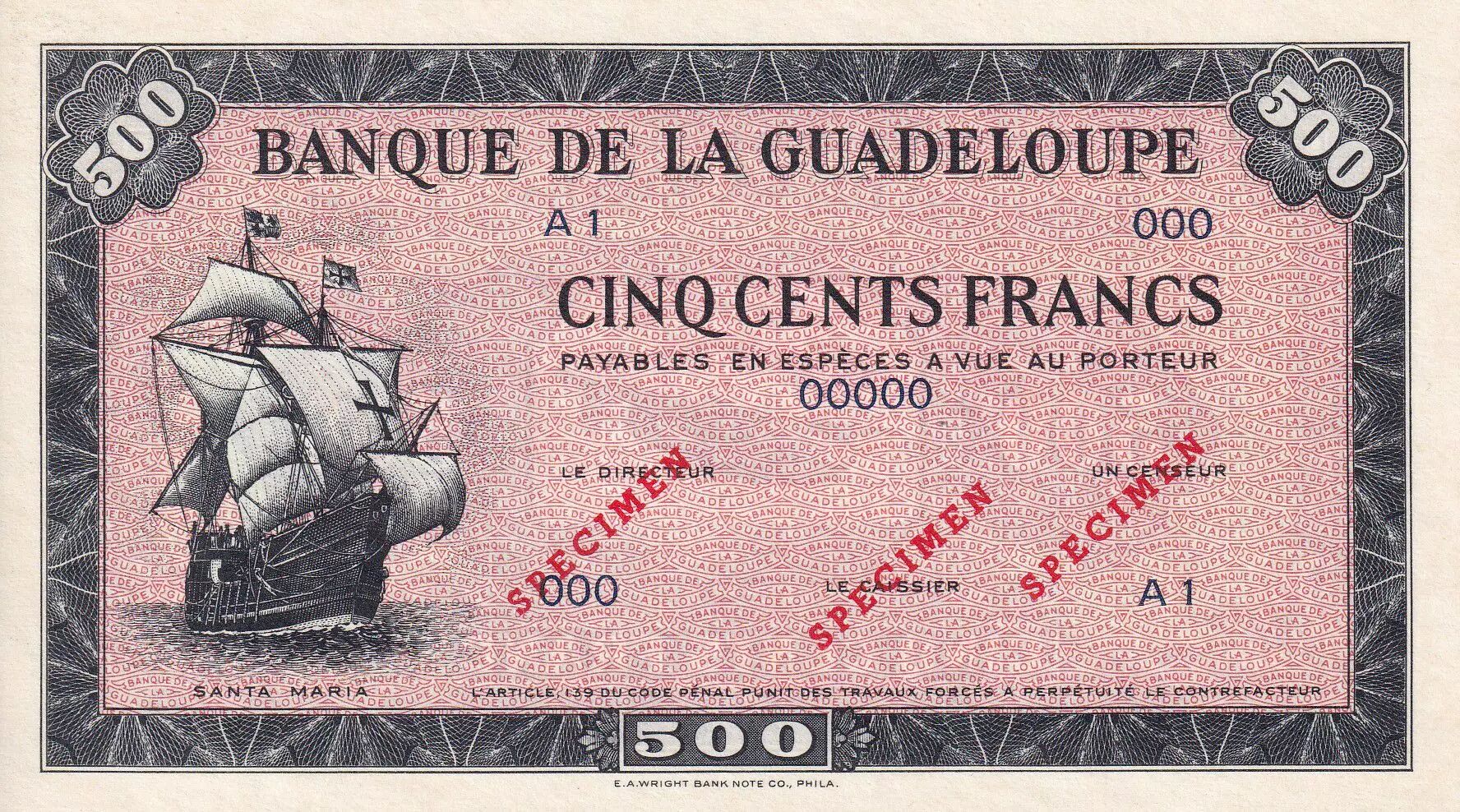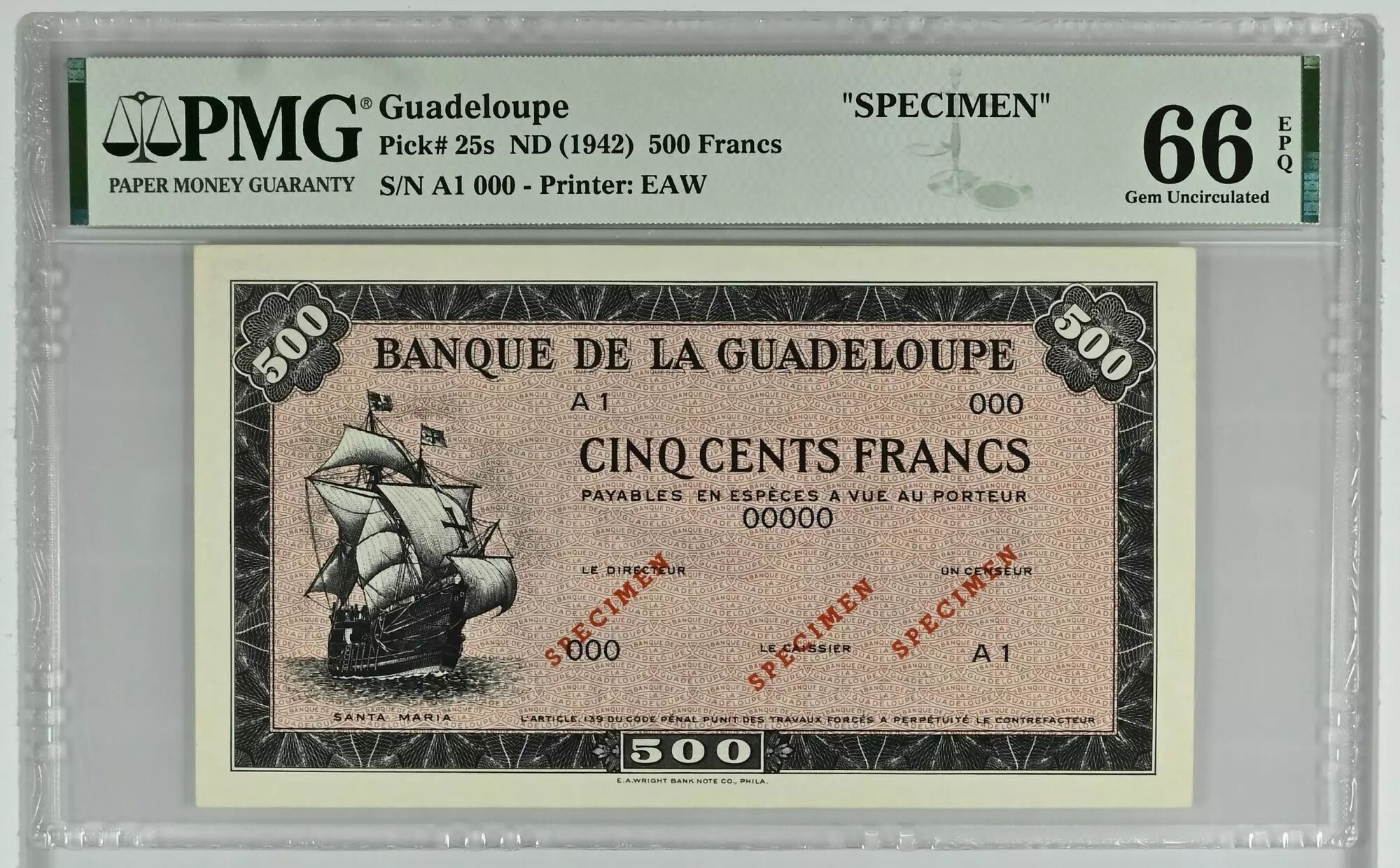 Home > > Guadeloupe 500 Francs - Santa Maria - 1945 - Specimen A.1 - PMG 66 EPQ - P.25s