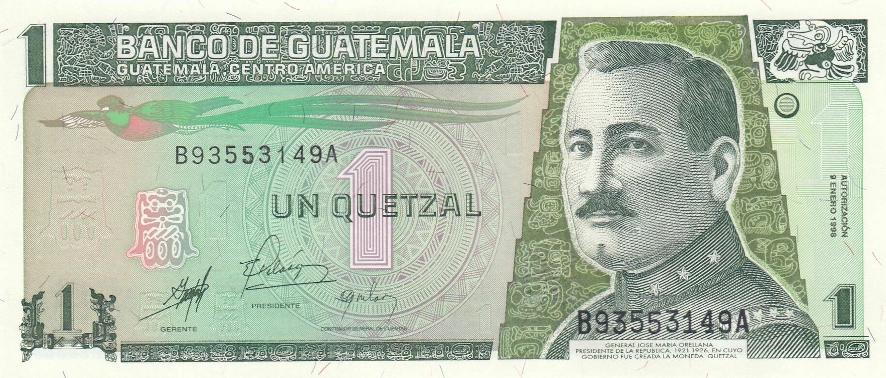 Le billet de 1 quetzal de 1998, série B, est un témoignage de l'histoire et de la culture du Guatemala, à travers la représentation du Général Orellana, des symboles historiques et architecturaux du pays.