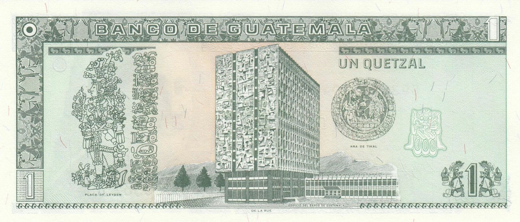 Au verso, on observe une représentation de la Plaque de Leyden, un artefact historique. On y trouve également une image du bâtiment du Banco de Guatemala, l'institution émettrice. Le sceau de l'Ara del Tikal est également présent, ajoutant une dimension culturelle et historique au billet.