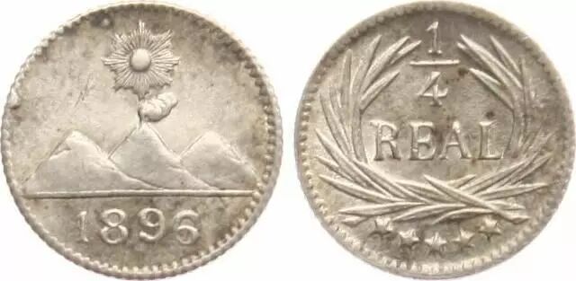 Pièce Guatemala 1/4 Real - Soleil rayonnant au-dessus de 3 volcans - 1896 - Argent
