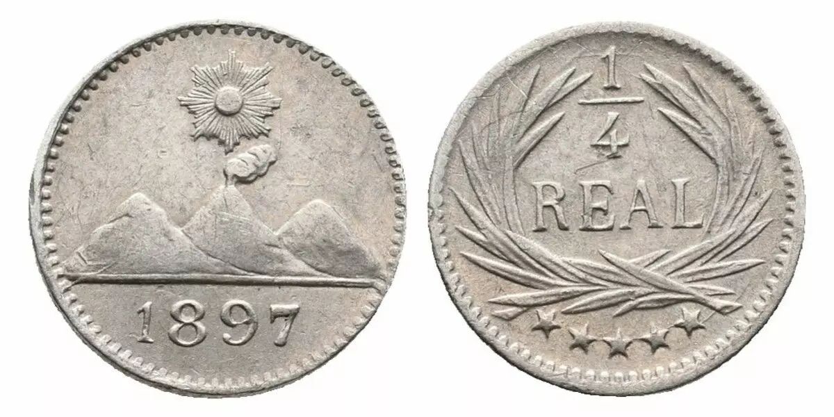 Pièce Guatemala 1/4 Real - Soleil rayonnant au-dessus de 3 volcans - 1897 - Argent
