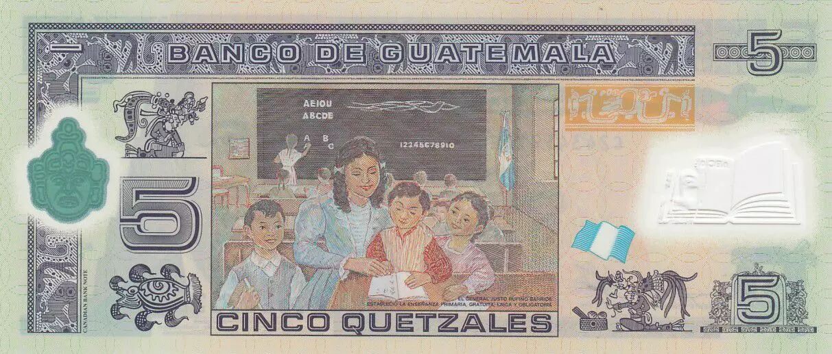 Home > > Guatemala 5 Quetzales J. Rufino Barrios, school (Canadian Bank Note) - Polymer - UNC - P.122b