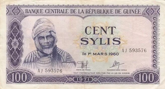 Banknote Guinea 100 Sylis 1960 - A.S. Touré - Open pit bauxite mining - Serial AJ