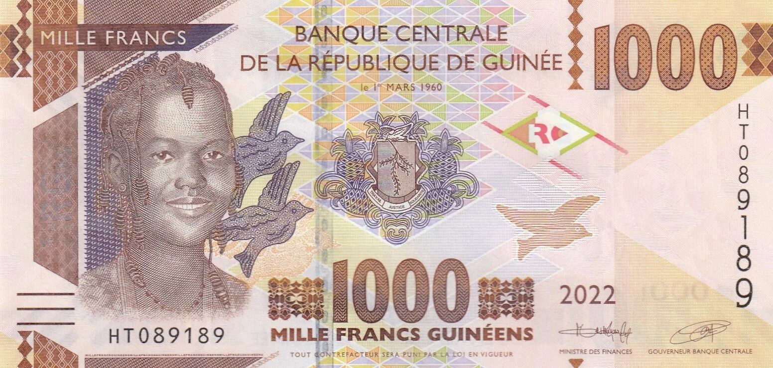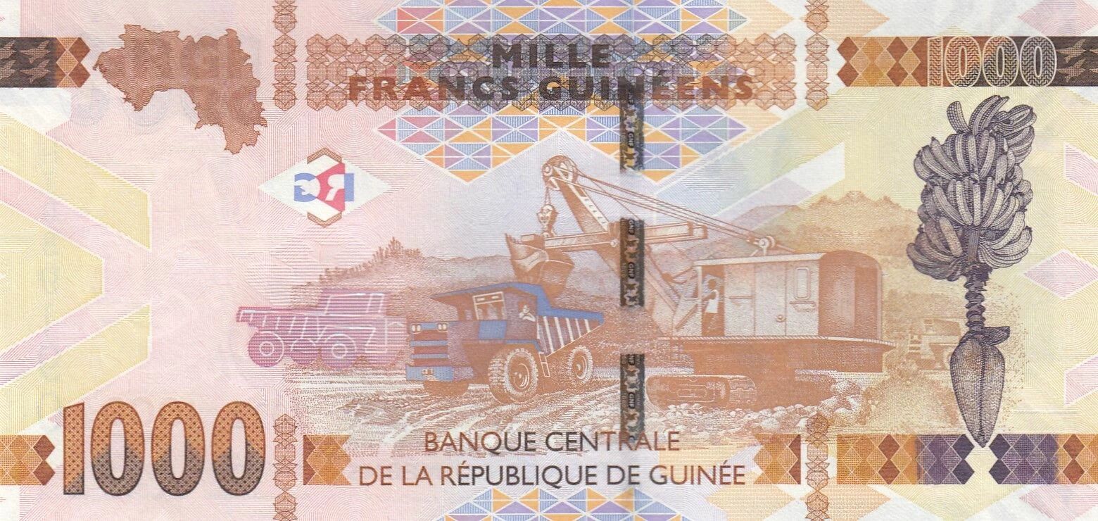 On one side, the banknote features a female figure. This representation may symbolize various aspects such as motherhood, fertility, or an important role of women in Guinean society. In the background, a construction site is depicted, suggesting economic development and infrastructure under construction in the country. This association of the female figure and the construction site may symbolize the role of women in the progress and construction of the nation.