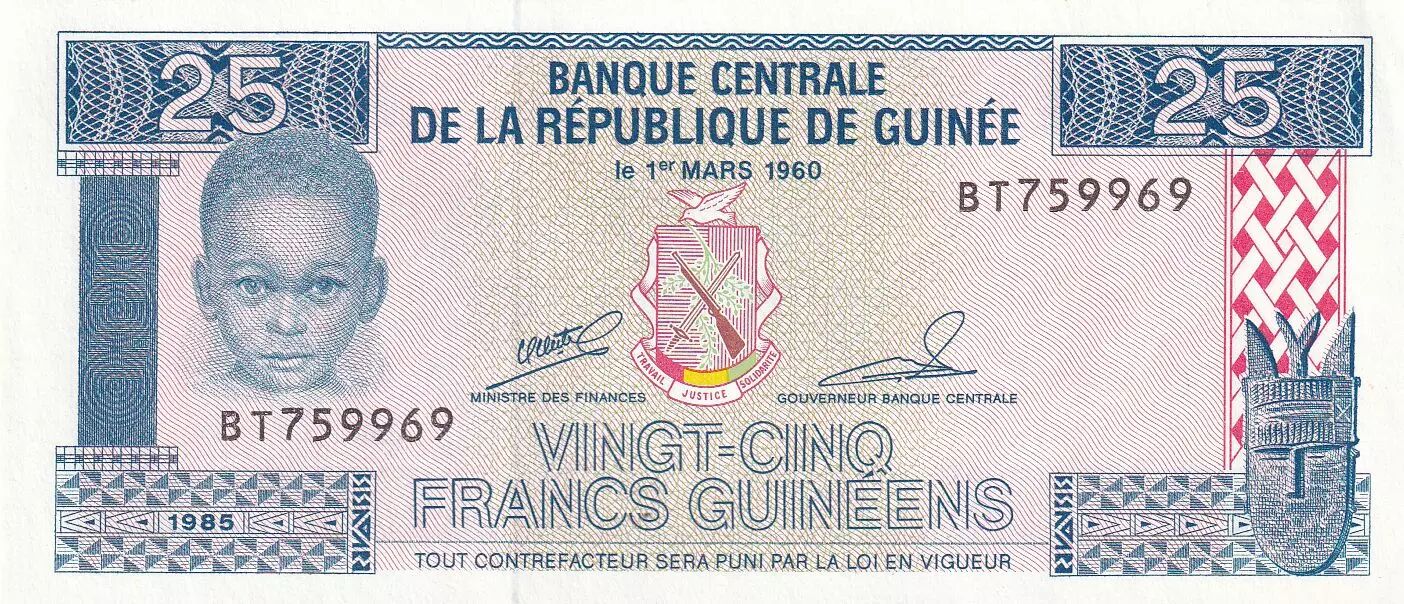Banknote Guinea 25 Francs - Young boy - Girl by huts - 1985 - Serial BT - P.28