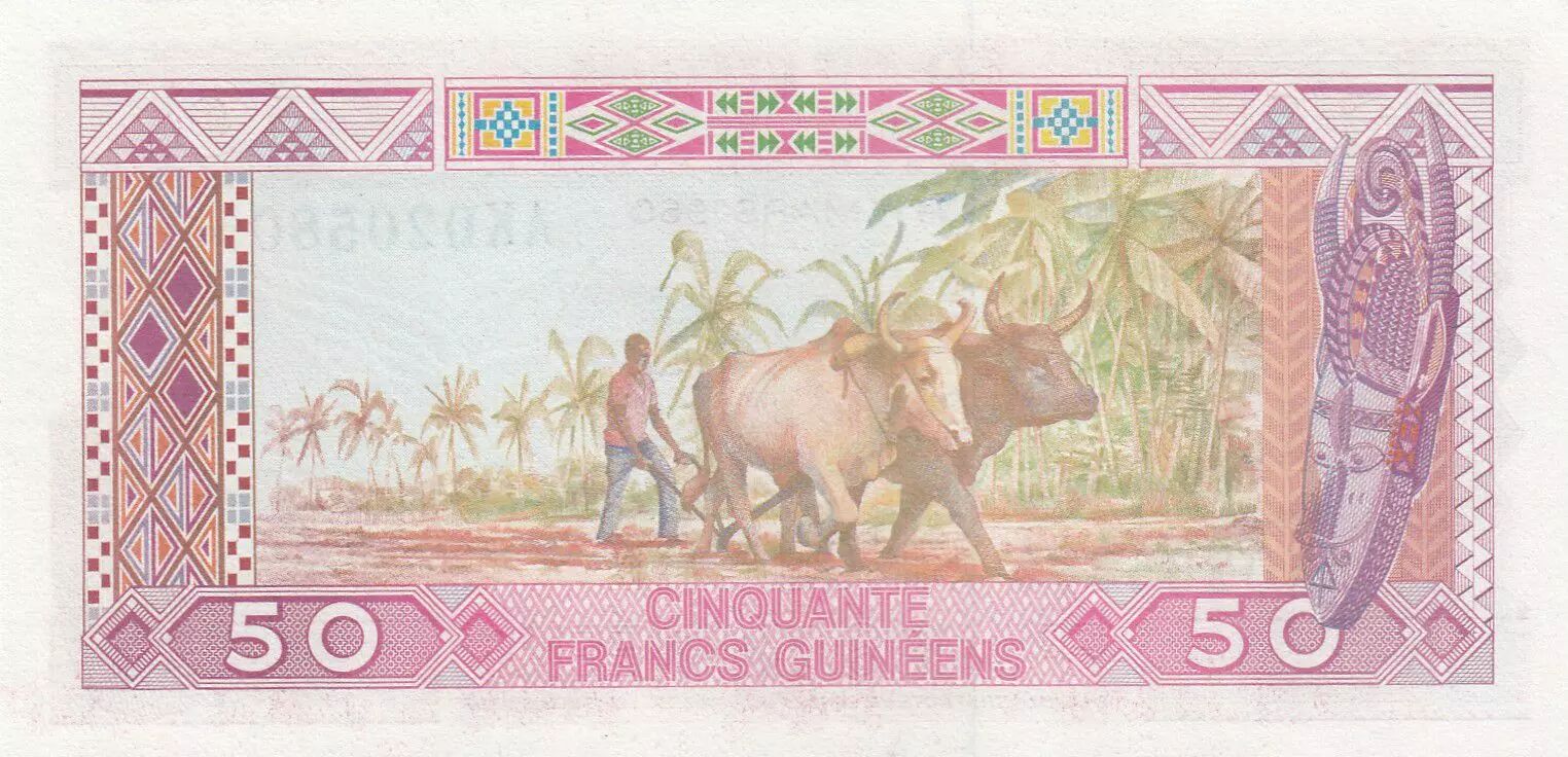 Home > > Guinea 50 Francs - Man, Ox - 1985 - UNC - P.29