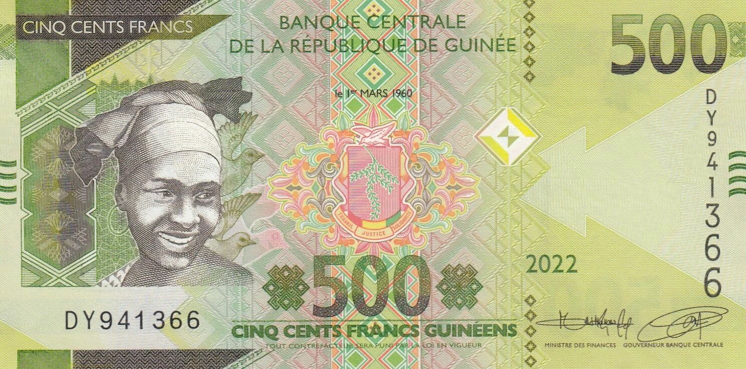 The face value of the banknote is 500 francs, the monetary unit of Guinea. The year of issue, 2022, indicates the date of production and circulation of this specific banknote.