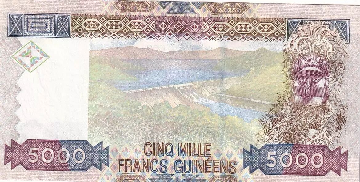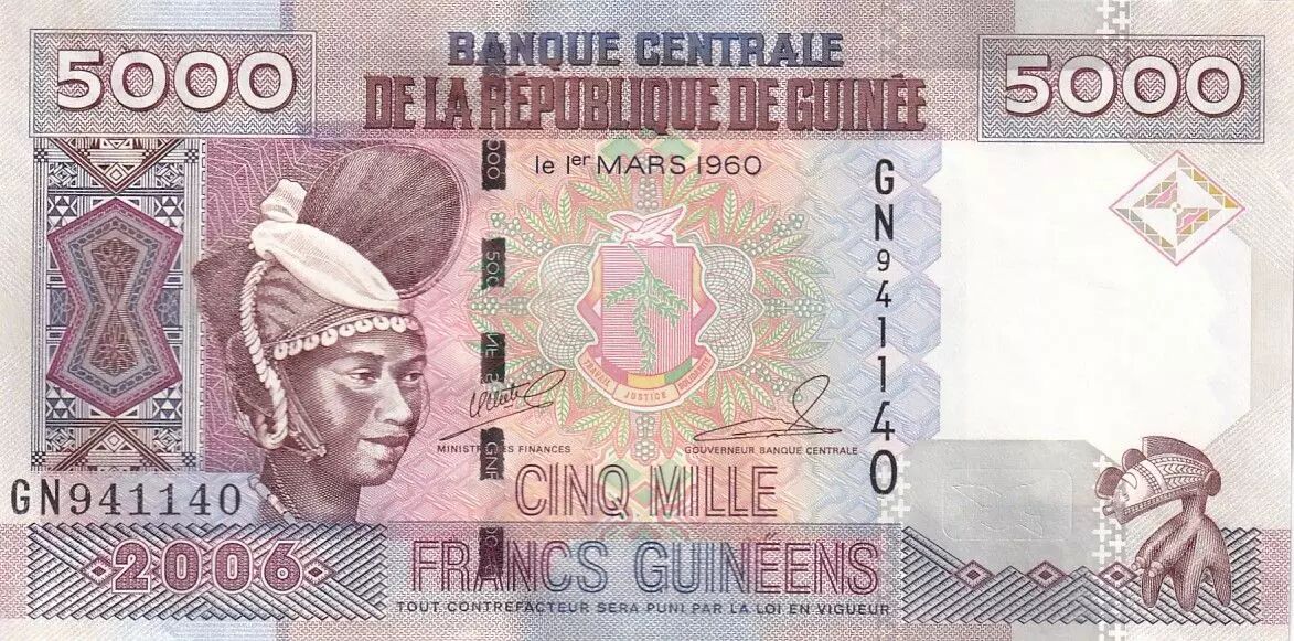 This banknote is issued by the Central Bank of the Republic of Guinea. It has a face value of 5000 Guinean francs. Its year of issue is 2006 and it belongs to the GN series.