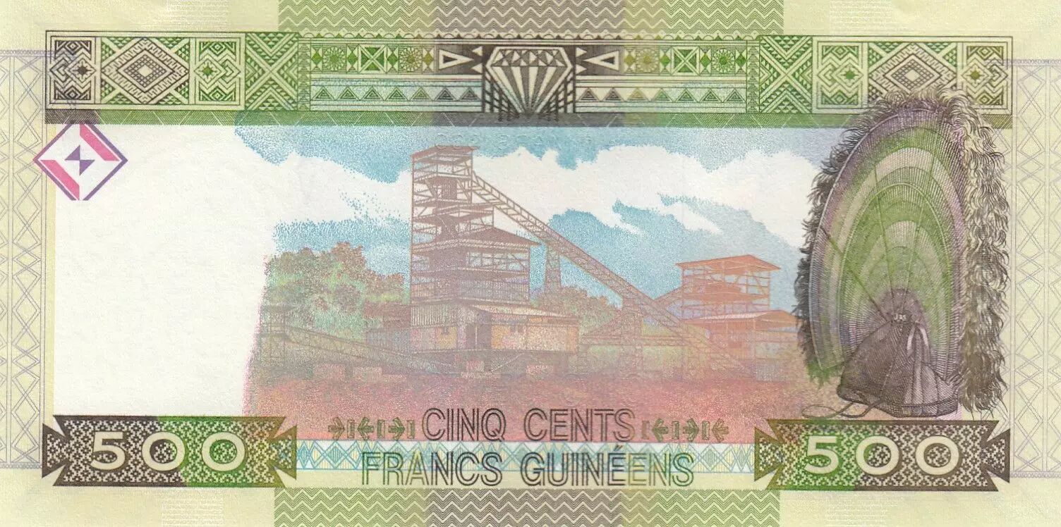 Au verso, le billet illustre un paysage industriel lié à l'exploitation minière. On y trouve une tête de puits de mine, ainsi que des installations minières, reflétant l'activité extractive présente dans le pays. L'iconographie met en évidence l'importance de l'industrie minière pour la Guinée.