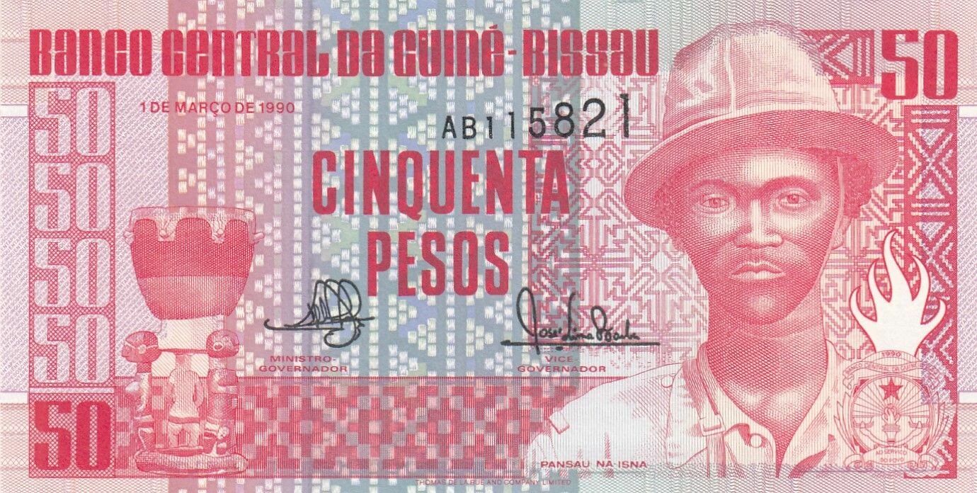 Le recto du billet présente un portrait de Pansau Na Isna, figure marquante en tant que combattant de la guerre coloniale de Guinée-Portugaise (1964-1974). Les inscriptions en latin comprennent la désignation de l'institution émettrice, "BANCO CENTRAL DA GUINÉ-BISSAU", la date d'émission, "1 DE MARÇO DE 1990", la valeur nominale "CINQUENTA PESOS", et le nom de la personnalité honorée, "PANSAU NA ISNA".