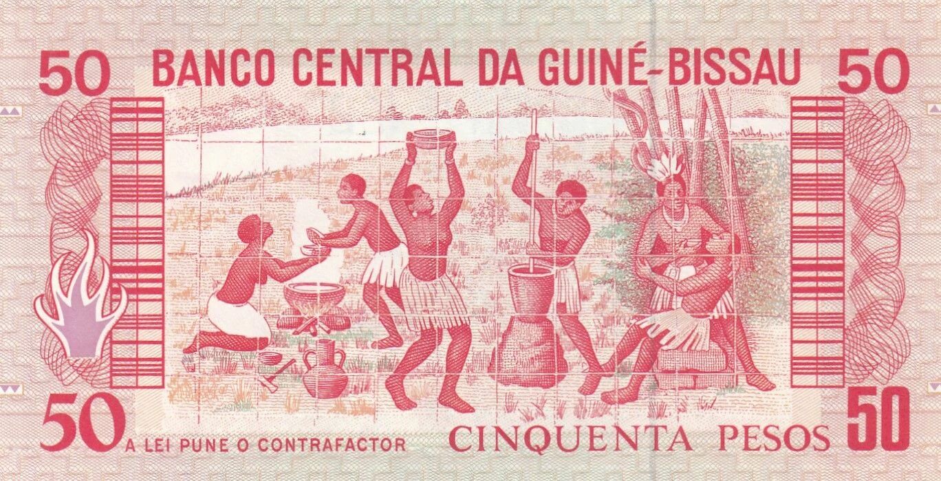 Au verso, une scène villageoise est représentée. On y retrouve également des inscriptions en latin, notamment le nom de l'institution émettrice, "BANCO CENTRAL DA GUINÉ-BISSAU", et un avertissement légal, "A LEI PUNE O CONTRAFACTOR", signifiant que la loi punit la contrefaçon, ainsi que la valeur nominale, "CINQUENTA PESOS".