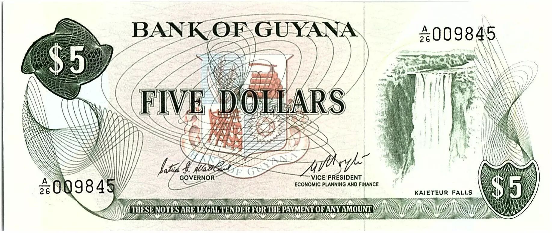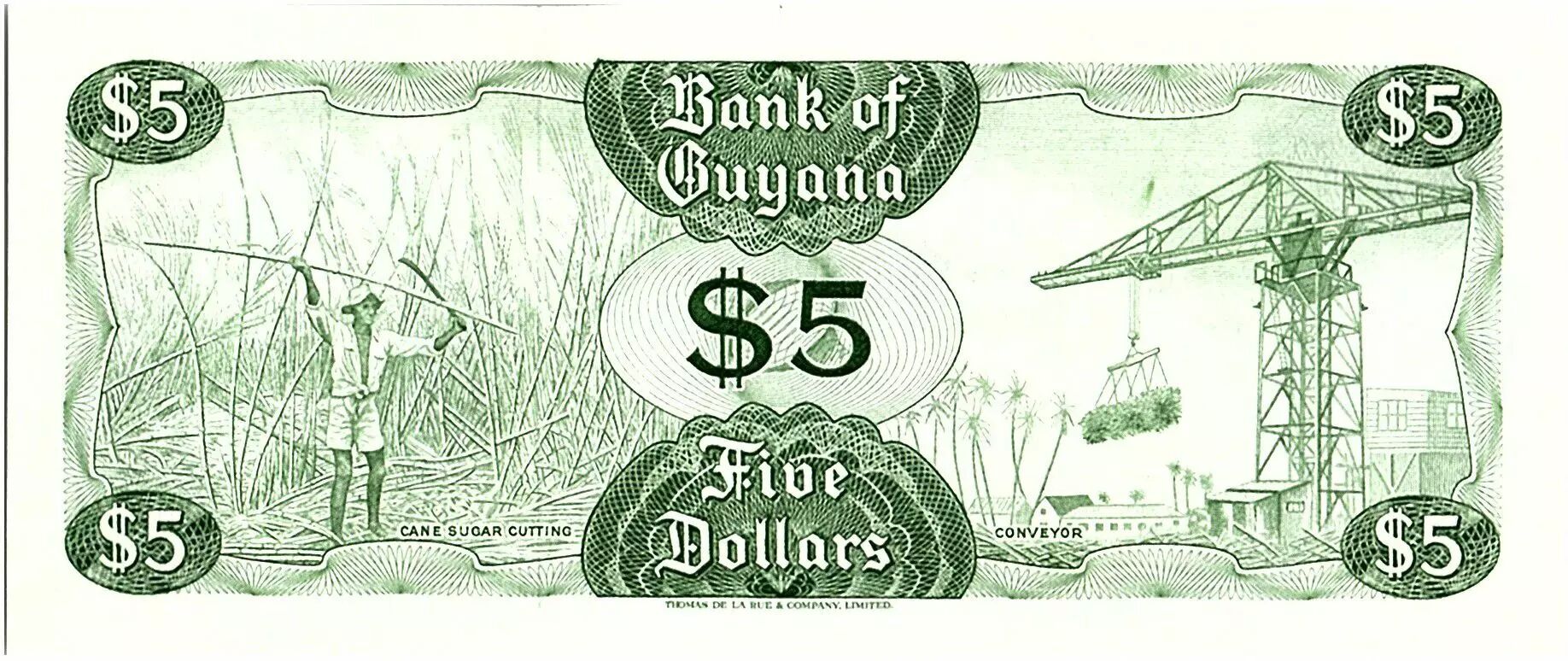 Banknote Guyana 5 Dollars, Kaieteur Falls, Cane sugar cutting - 1983