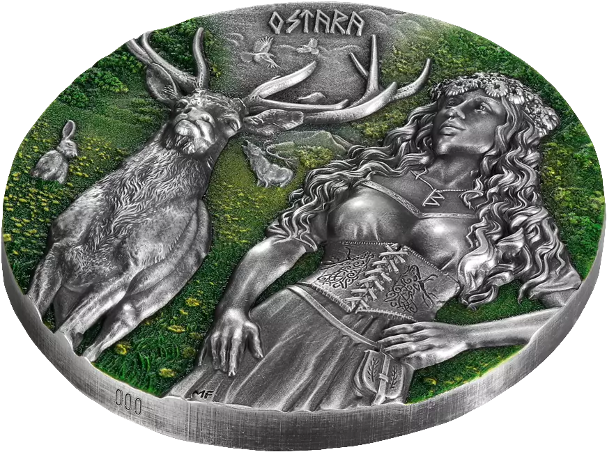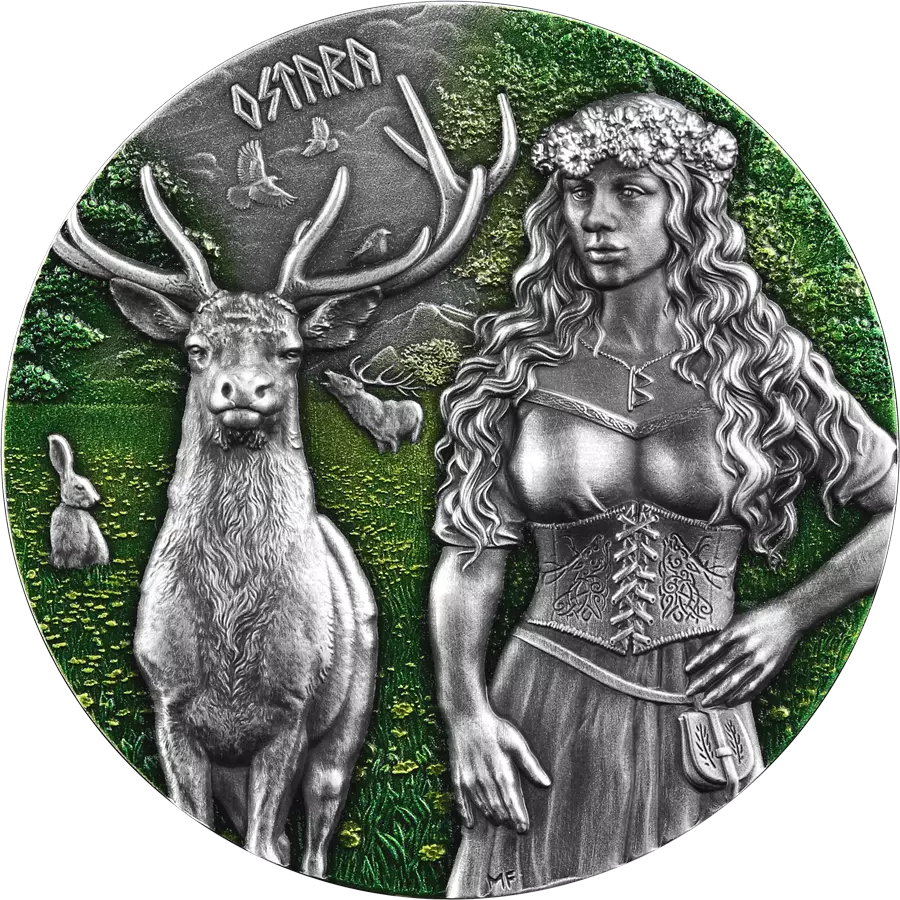 Sur l'avers Ostara la déesse de la victoire de la vie sur la mort est accompagnée d'un cerf et d'un lièvre symboles de fertilité. Selon les croyances alors qu'elle marchait dans la neige la Valkyrie a trouvé un oiseau blessé et l'a transformé en un animal plus résistant au froid un lapin. Ostara elle-même est vêtue d'une robe blanche aérienne et d'une guirlande florale. Son décolleté est orné de la rune Berkanan responsable de la vitalité et de la régénération de la fertilité féminine et de la beauté.