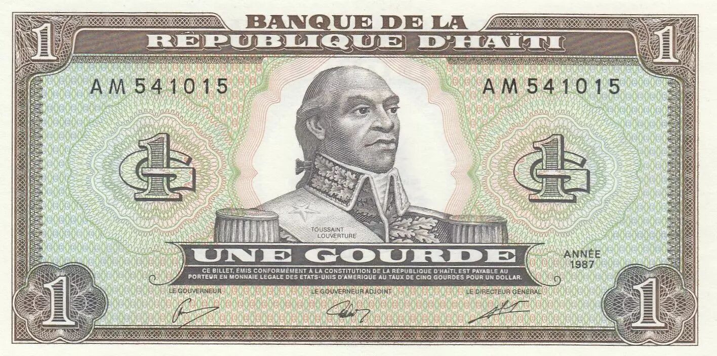Home > World Banknotes > American Banknotes > Haiti > Haiti 1 Gourde - Toussaint L'Ouverture - Arms - 1989 - Serial letter B