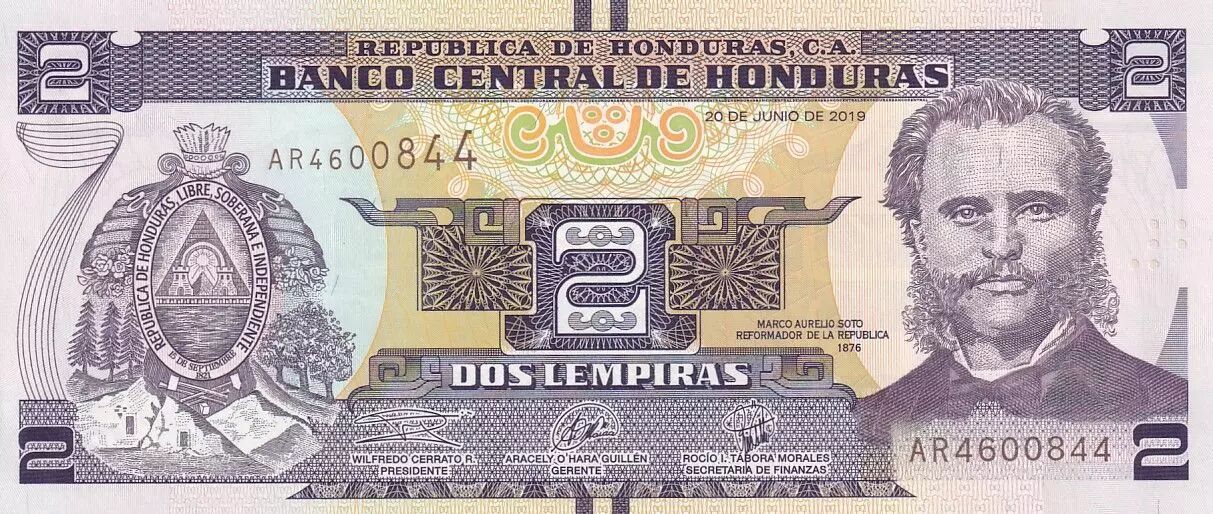 Billet Honduras 2 Lempiras - Marco Aurelio Soto - Ile du Tigre - 2019 - Série AR