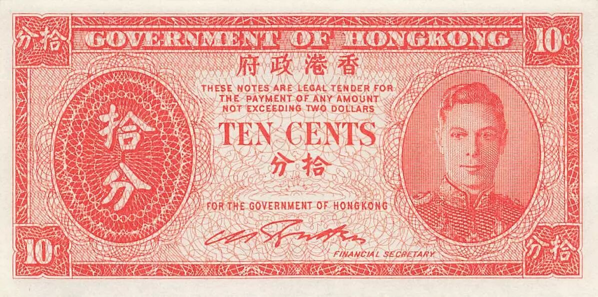 Home > World Banknotes > Asian Banknotes > Hong Kong > Hong Kong 10 Cents - George VI - ND (1945) - Uniface - P.323
