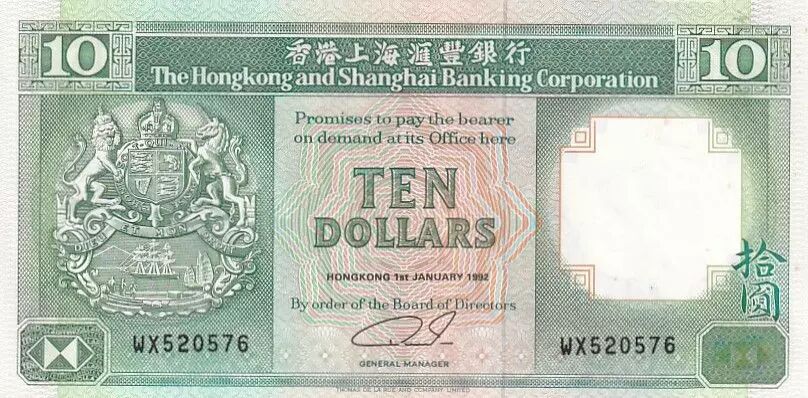 Accueil > Billets du Monde > Billets d'Asie > Hong-Kong > Hong-Kong 10 Dollars Armoiries - HSBC - 1992