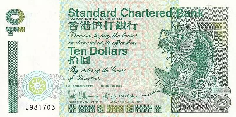 Home > World Banknotes > Asian Banknotes > Hong Kong > Hong Kong 10 Dollars Standard Chartered Bank - Carp - 1993