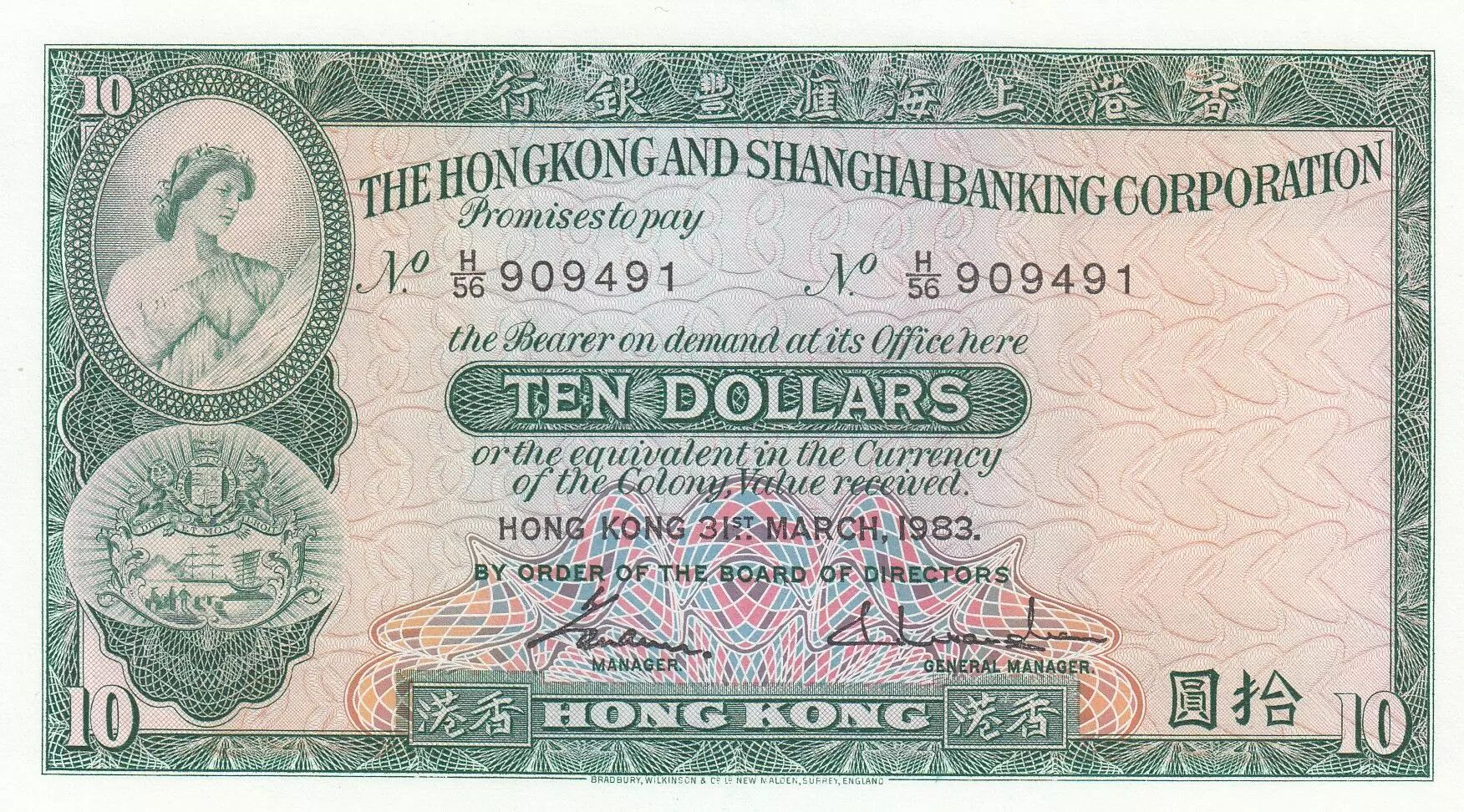 Home > World Banknotes > Asian Banknotes > Hong Kong > Hong Kong 10 Dollars, Woman and arms - Building - 1983 - P.182 j