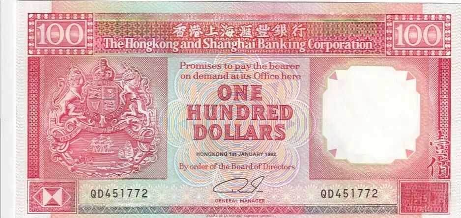 Home > World Banknotes > Asian Banknotes > Hong Kong > Hong Kong 100 Dollars Arms - HSBC - 1992
