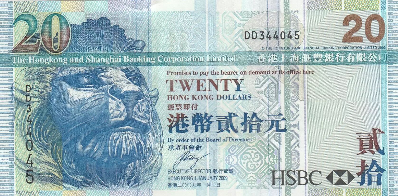 Home > World Banknotes > Asian Banknotes > Hong Kong > Hong Kong 20 Dollars, Head of lion - HSBC - 2009