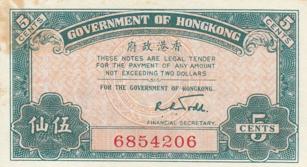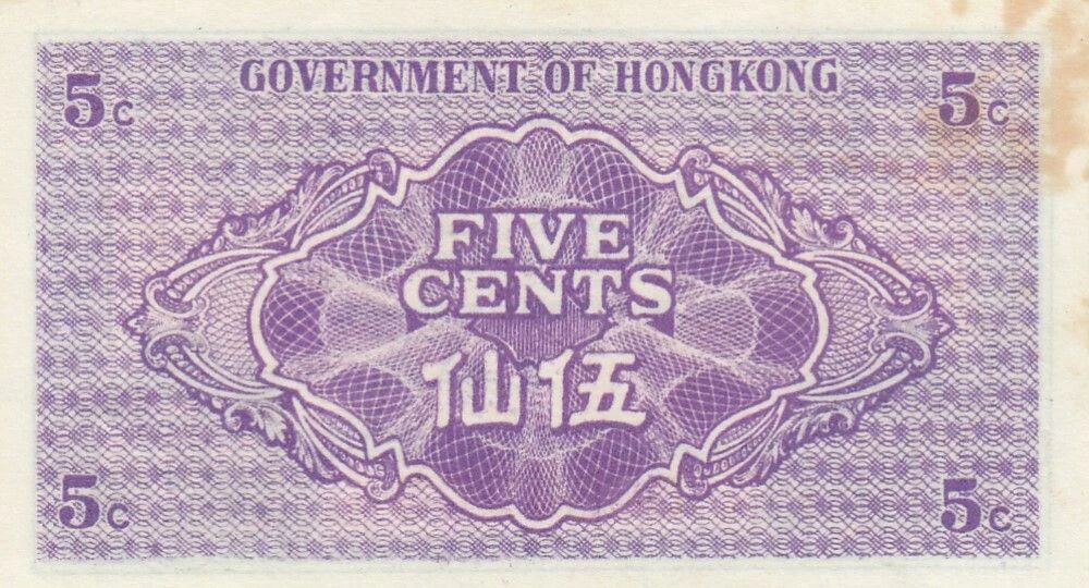 Le recto du billet présente des éléments graphiques et textuels spécifiques à l'émission. On y trouve des inscriptions en anglais et potentiellement en chinois, indiquant la valeur nominale "5 CENTS" et le nom de l'émetteur, "HONG KONG GOVERNMENT". Le design inclut des motifs ornementaux et des éléments de sécurité, tels que des guilloches et des bordures décoratives. La couleur dominante du recto est susceptible de varier, mais elle est généralement choisie pour assurer la lisibilité et l'authenticité du billet.