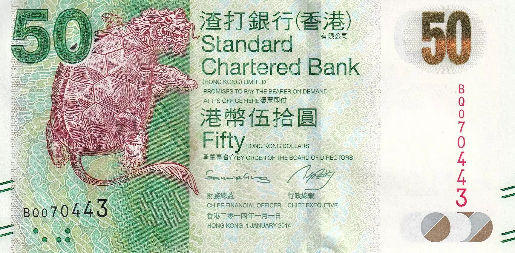 Accueil > Billets du Monde > Billets d'Asie > Hong-Kong > Hong-Kong 50 Dollars - Tortue - Fermeture à combinaison chinoise - 2014 - Série BQ - P.298d