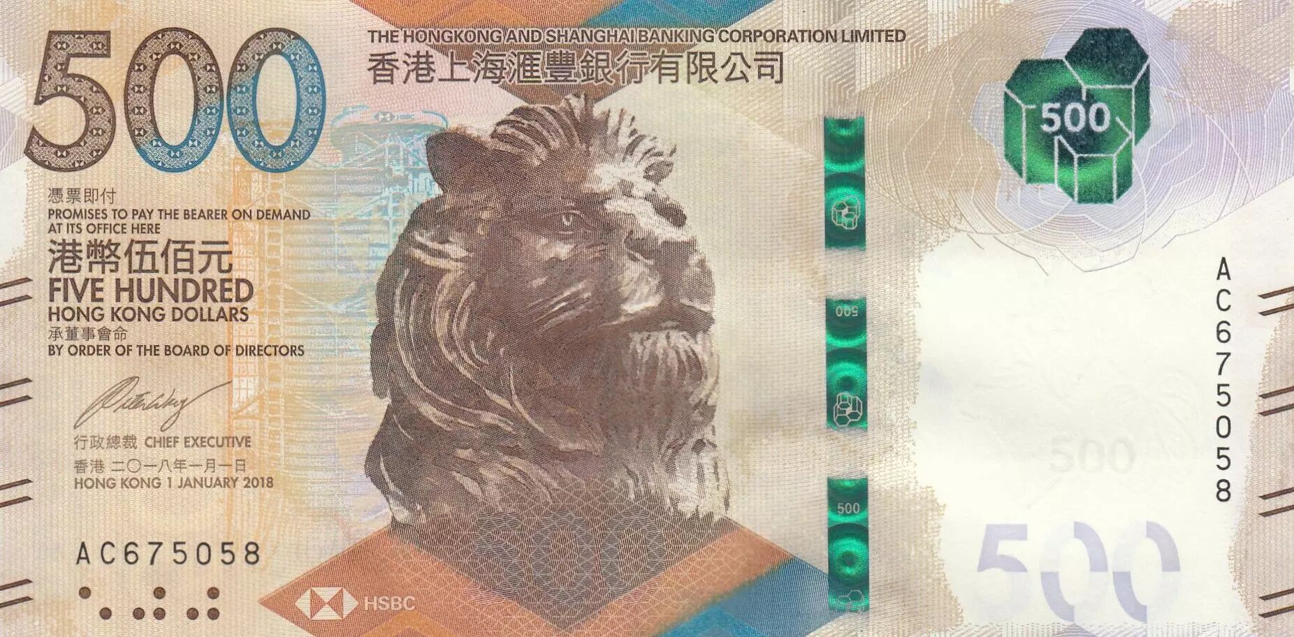 Home > World Banknotes > Asian Banknotes > Hong Kong > Hong Kong 500 Dollars, Head of lion - HSBC - 2018