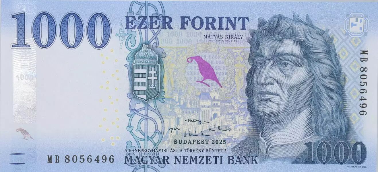 Ce billet de banque de Hongrie a une valeur nominale de 1000 forints et a été émis en 2025. Il fait partie d'une série non spécifiée. Ses dimensions sont de 154 mm de longueur et 70 mm de largeur.