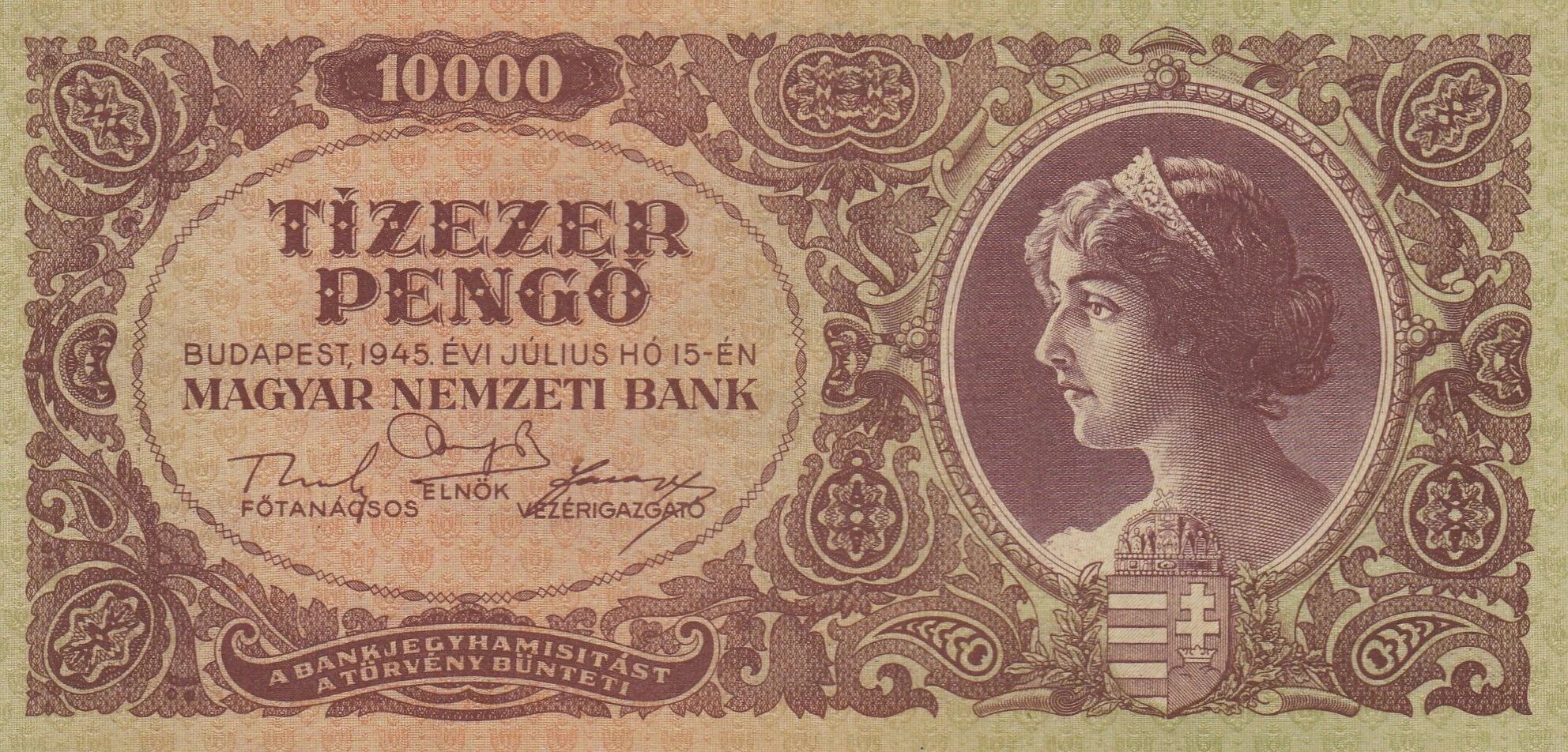 Ce billet de banque a été émis par la Hongrie, avec une valeur nominale de 10000 peng?. Il s'agit d'un moyen de paiement ayant circulé durant l'année 1945.